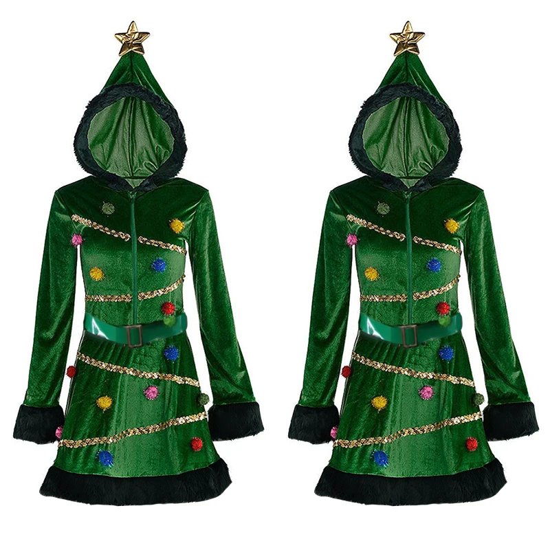 Women Christmas Tree Dress Costume Hooded Sequin Fancy Costume with Belt Xmas Outfits